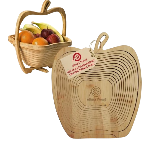 This charming Apple-Shaped Bamboo Basket brings a delightful blend of natural beauty and practicality to any home. Crafted from high-quality, eco-friendly bamboo, it features a unique apple silhouette that adds a playful yet elegant touch to your kitchen or dining table. The open-air weave design allows fruits and vegetables to breathe, helping them stay fresh longer. Lightweight yet sturdy, it is perfect for holding fruits, snacks, bread, or household essentials. Its foldable, convertible design also allows it to transform into a flat cutting board or serving tray, making it a versatile multi-purpose piece. The smooth, polished finish ensures easy cleaning and long-lasting durability. Ideal for everyday use, gifting, or decorative displays. Add natural warmth and style to your home with this beautiful bamboo basket.