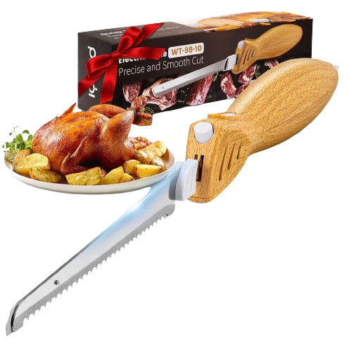 An electric knife is a handy kitchen tool designed to slice through food with speed and precision. It features sharp, serrated blades that move back and forth rapidly for effortless cutting. Ideal for carving meats, slicing bread, or portioning large fruits, it saves time and reduces strain on the hands. Most models come with a comfortable, ergonomic handle for safe use. Many electric knives include removable blades for easy cleaning. Some versions are cordless, offering greater flexibility during use. Itβs perfect for holiday meals, barbecues, or everyday cooking. Lightweight yet powerful, it ensures clean, even cuts every time. An electric knife adds convenience to any kitchen.
