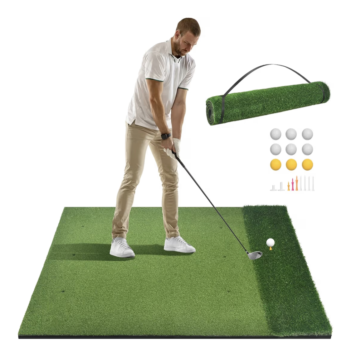Perfect your swing anytime with this high-quality golf mat. Designed for indoor or outdoor use, it simulates real fairway and rough conditions. Made with durable, anti-slip rubber backing for stability during every shot. The turf is soft yet resilient, protecting your clubs while offering a realistic feel. Ideal for practicing drives, chips, and putts at home or in the backyard. Easy to roll up and store when not in use. Great for beginners and seasoned golfers alike. Compatible with golf nets and ball return systems. Train like a pro wherever you are with this versatile practice mat.