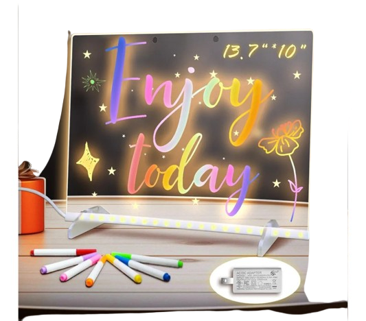 A LED note board is a modern and creative way to display messages, reminders, or decorative notes. It features a smooth writing surface illuminated by built-in LED lights, making your writings glow beautifully. The board is reusable and allows you to write or draw with special fluorescent markers that can be easily wiped off. It is perfect for homes, cafes, restaurants, offices, or study areas where messages need to stand out. The bright and colorful lighting attracts attention and adds a fun touch to any environment. Many LED note boards come with adjustable light settings, giving you the choice of different colors or flashing effects. Its lightweight and portable design makes it easy to place on desks, walls, or countertops. The energy-efficient LED lights ensure long-lasting performance without high power consumption. A LED note board is both functional and stylish, making communication and creativity more exciting.
