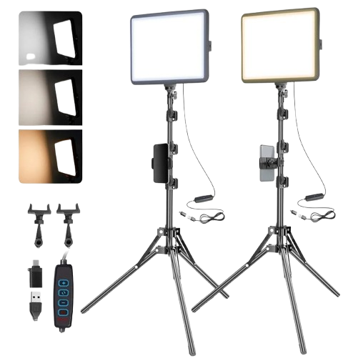 This 2 Pack LED Video Light Kit is designed to deliver professional lighting for photography, video recording, live streaming, and content creation. Each light features adjustable brightness and color temperature, allowing you to achieve perfect lighting for any setting. The kit includes sturdy tripod stands that extend to various heights for flexible positioning. With soft diffusers, it produces even and natural illumination that reduces harsh shadows. Compact and lightweight, the lights are easy to carry and set up anywhere. They offer both USB and battery power options for convenience during shoots. Ideal for YouTubers, makeup artists, and photographers, this kit ensures consistent, high-quality lighting. The durable aluminum design provides stability and long-lasting use. Upgrade your lighting setup with this versatile and portable LED kit for stunning visual results every time.