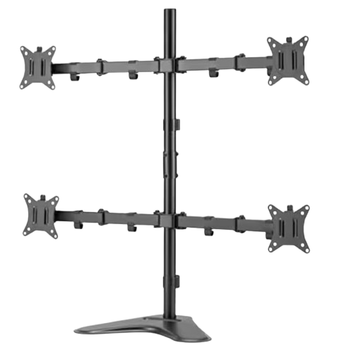 Upgrade your workstation with this quad monitor stand, designed to hold four screens securely while maximizing desk space and productivity. Built with a heavy-duty steel frame, it offers exceptional stability and supports multiple monitor sizes with ease. Fully adjustable arms allow you to tilt, swivel, rotate, and adjust height for an ergonomic viewing angle that reduces neck and eye strain during long hours. The stand features both clamp and grommet mounting options for flexible installation, along with integrated cable management to keep your setup clean and organized. Ideal for professionals, gamers, and multitaskers, this quad monitor stand creates a sleek, efficient, and immersive workspace.