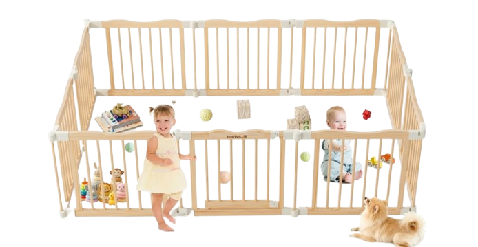 This foldable wooden playpen provides a safe, spacious, and stylish area for babies and toddlers to play, crawl, and explore. Crafted from sturdy natural wood with smooth, rounded edges, it ensures durability while protecting little hands from scratches. The foldable panel design allows for quick setup, easy storage, and flexible shape adjustment to fit different room layouts. With a secure locking system and a stable structure, it stays firmly in place during active play. Its open design offers full visibility for parents while blending seamlessly with modern home dΓ©cor, making it a practical and attractive solution for everyday child safety.